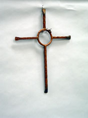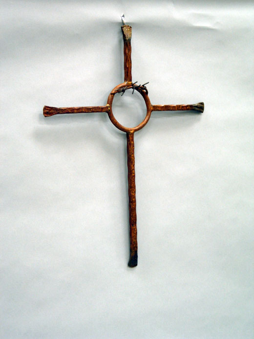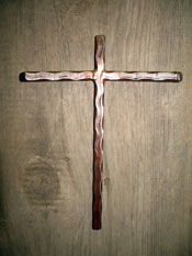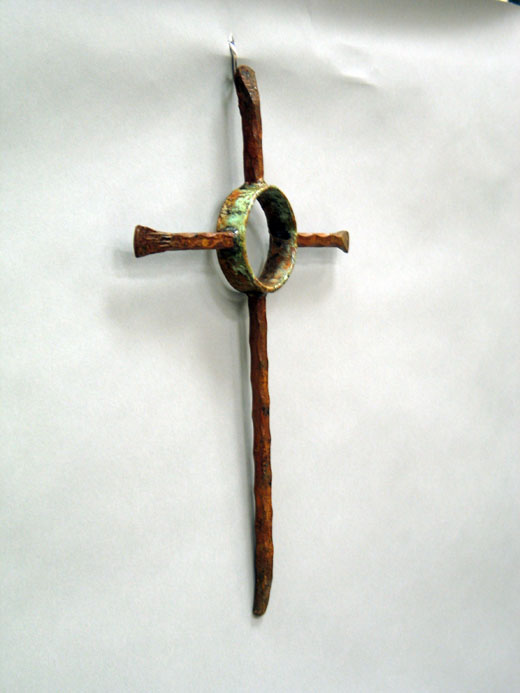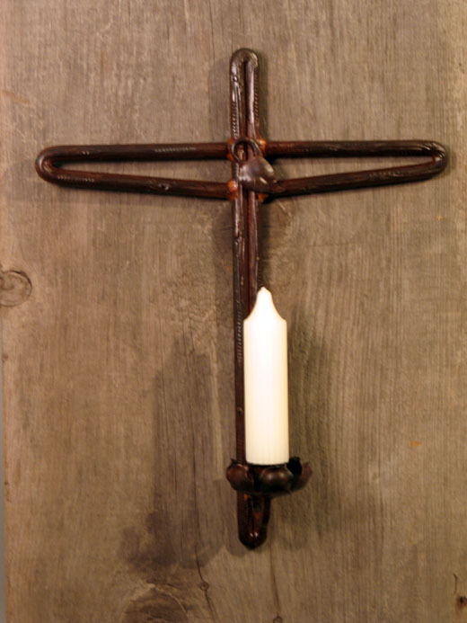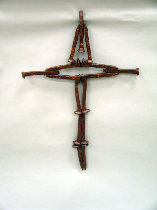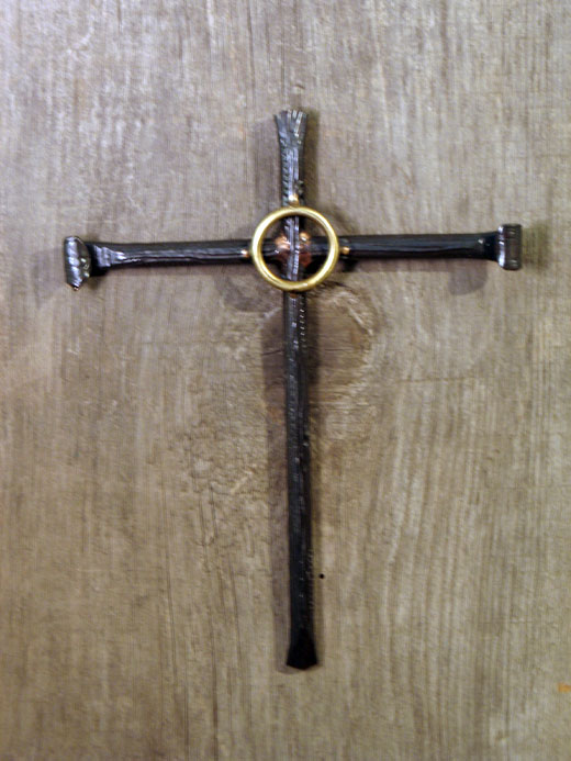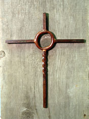 We create our crucifixes from railroad spikes which we collect across the country. We also offer a smaller crucifix created out of wrought iron and antique harness rings. Both types range in size and style and can be custom made to fit any area desired..