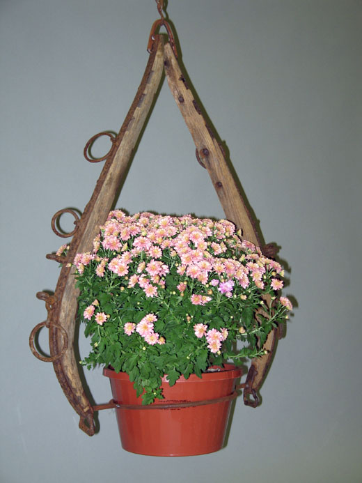 Plant hanges are made from harness hames and hold an 8" pot. We have 3 styles of hames, wood, wood with brass or steel balls and steel hames with brass or steel balls.