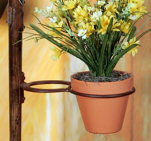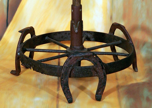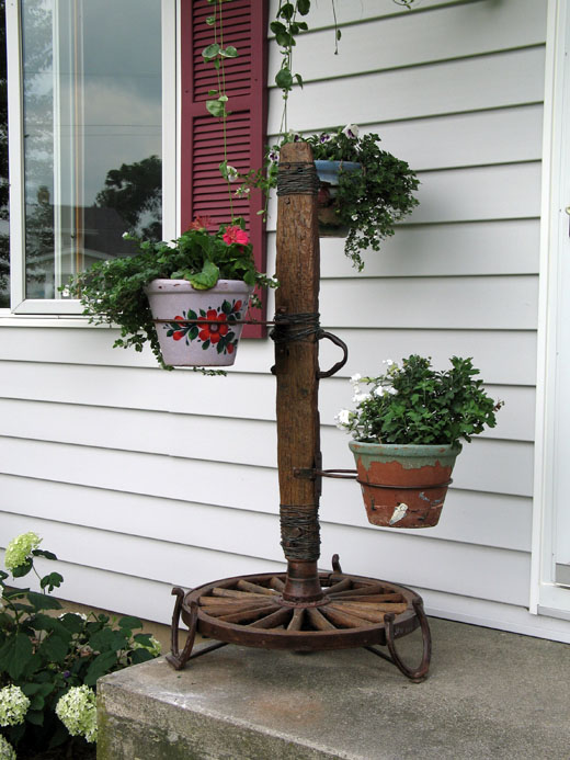Plant stands are created from single and double trees from antique horse drawn wagons and buggies. The base is an antique steel implement wheel with horseshoes for feet. Smaller stands hold 6" pots and larger stands hold 8" pots.